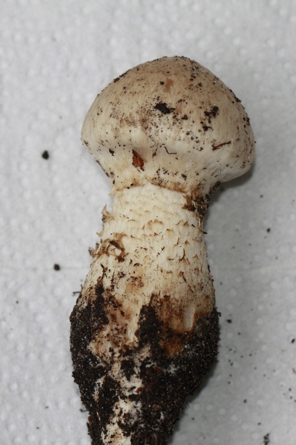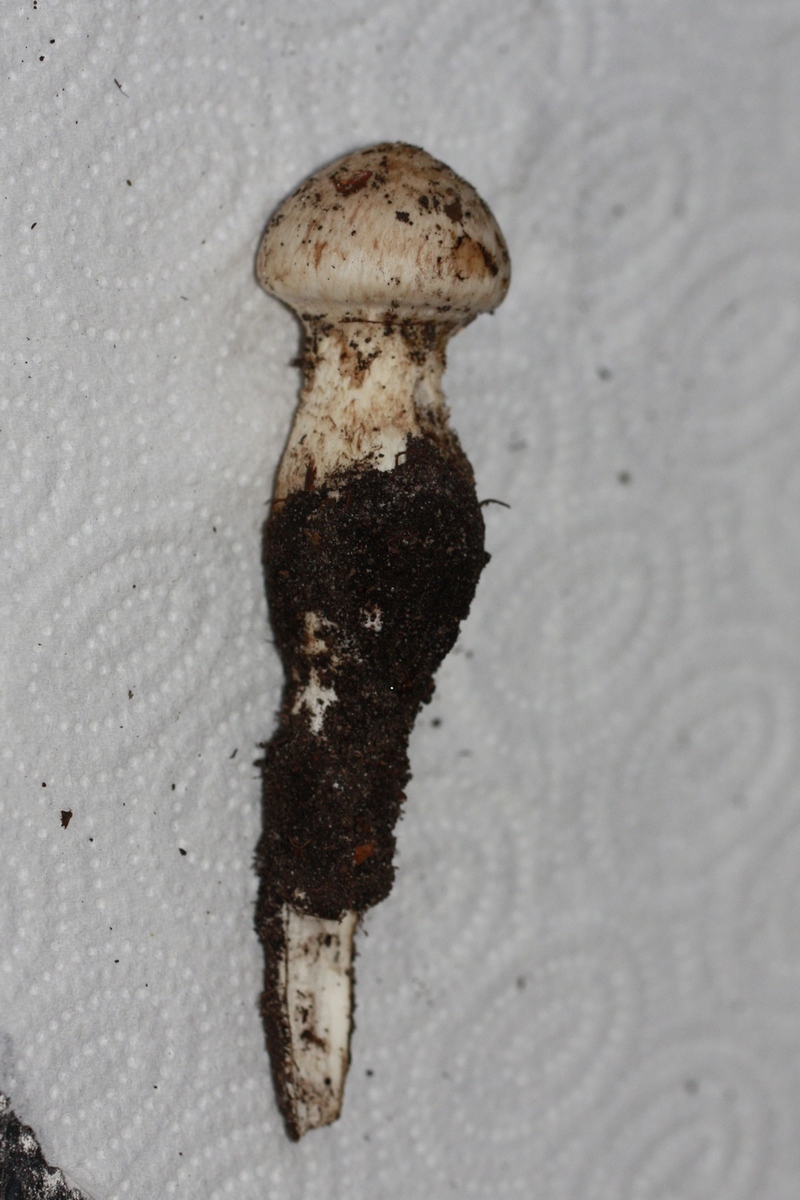 Ich war heute nochmals an dem Standort und habe einen Pilz aus dem Boden herausgezogen (s.Bild). Auffallend ist das lang wurzelnde Ende.