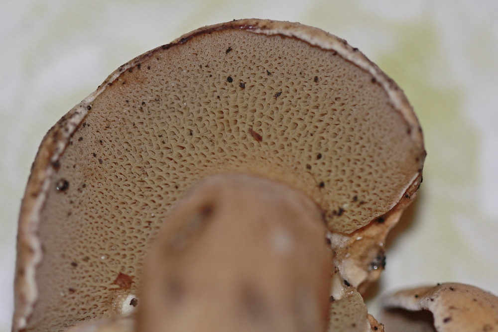 Bis 15 mm lang, Röhrenmündungen unregelmäßig löcherig mit schmalen Wänden, bei älteren Ex. In radialer Richtung länglich, besonders um den Stiel herum, dort auch fast lamellig und mit Zähnchen am Stiel herablaufend.