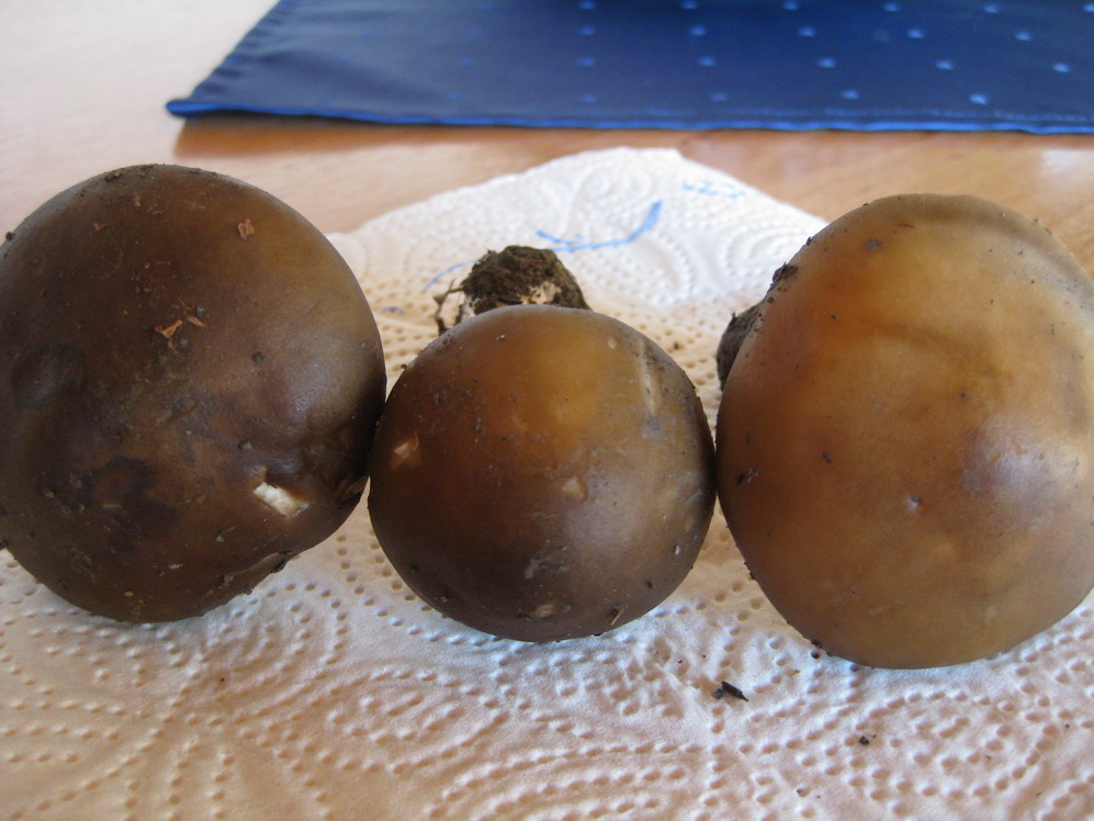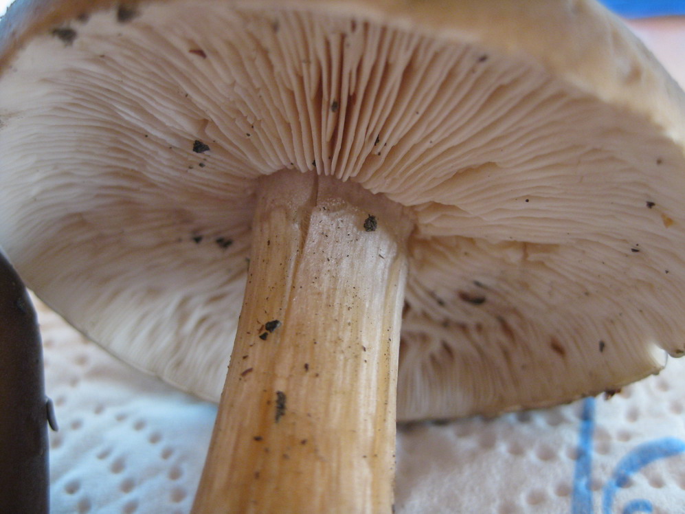 ich komme nicht weiter, kenne mich mit Lamellen überhaupt (noch) nicht aus. Ich habe diese braunen Pilze hier noch nie gesehen, traten aber zahlreich am Wegesrand unter Eiche, Birke, Buche, Fichte auf. Habe sie mitnehmen müssen, da ich keinen Fotoapparat dabei hatte. Der Pilz war fest, der Hut trocken bis leicht feucht, habe ihn auch durchgeschnitten - keine Verfärbung!