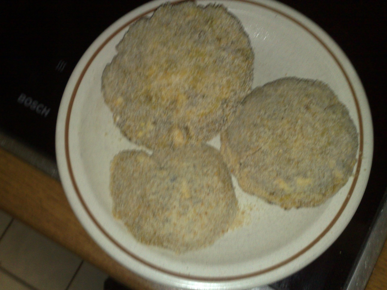 Und das könnte ich mir sehr gut mit Parasolen vorstellen. Ich würde sie füllen und dann mit einem Faden (wie bei Rouladen) über Kreuz zubinden. Dann kann man sie bequem panieren und beim Braten fallen sie auch nicht auseinander