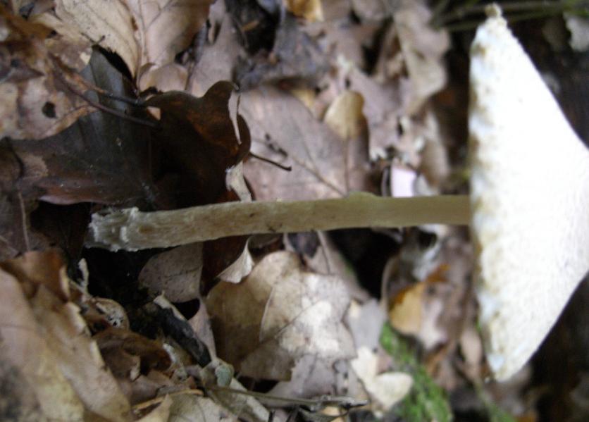 • Stiel: im Schnitt ist eine ocker-bräunliche Stielbasis zu sehen sowie eine Linie im gleichen Farbton im äußeren Bereich des gesamten Stieles zu erkennen, ähnlich braune Farbstellen zeigen sich auch im Hutfleisch (wohl nach Verletzung/Druck).