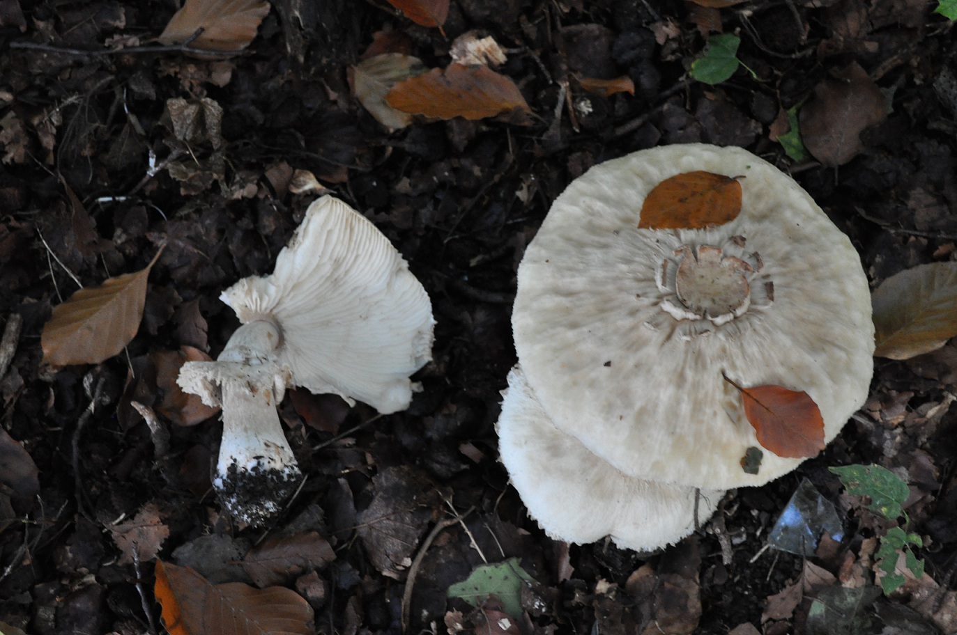 Auf dem zweiten Bild sieht man bei einem Pilz unten rechts an der Stielbasis, also unten, eine deutliche gelbe Verfärbung.