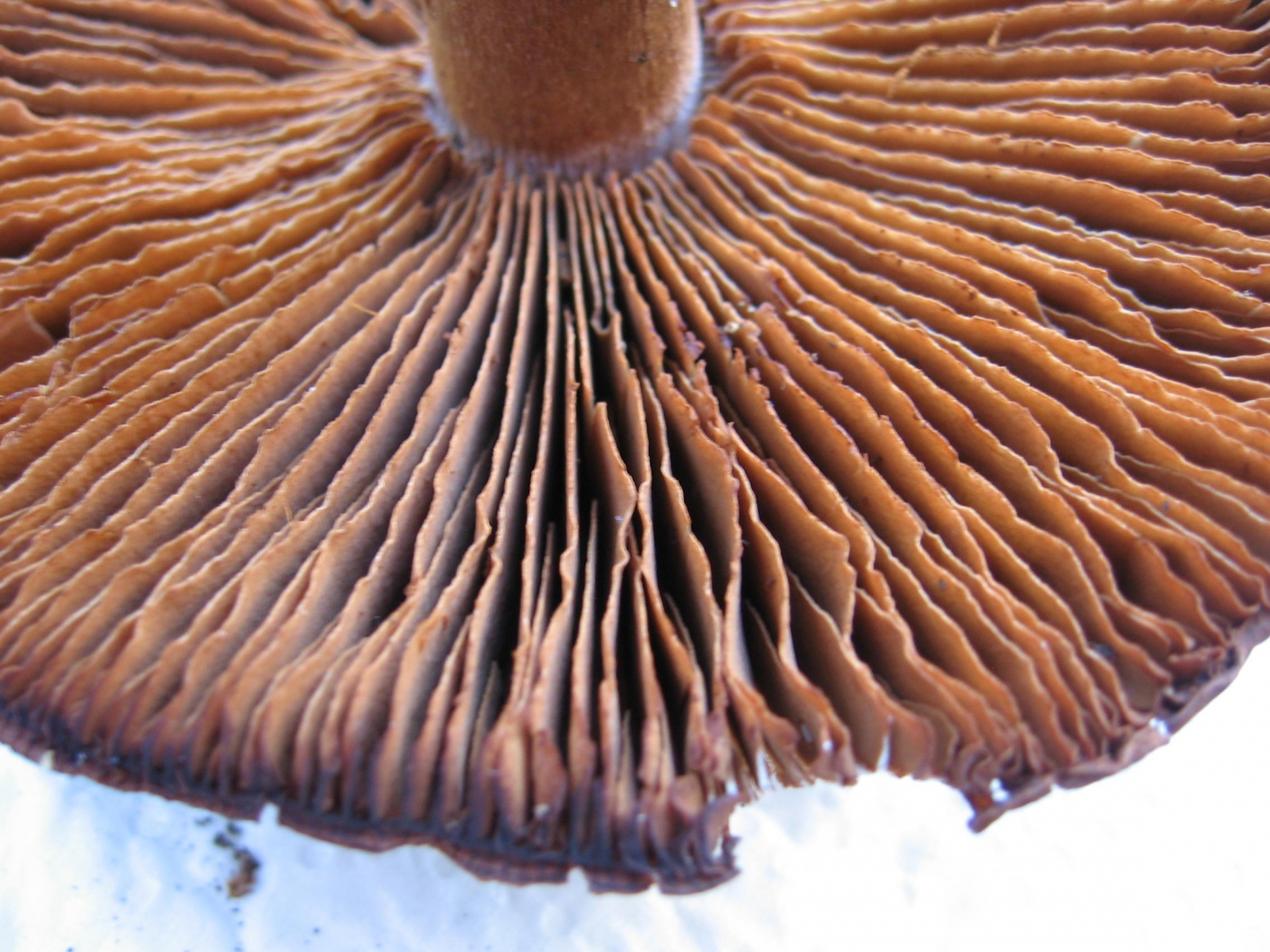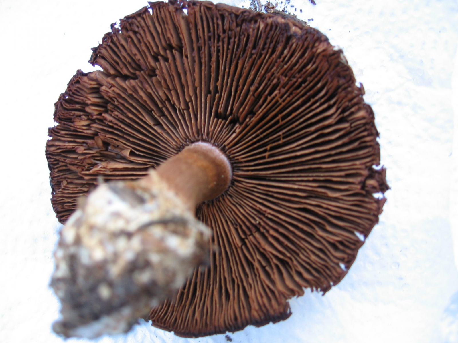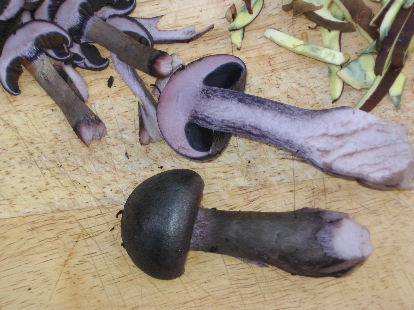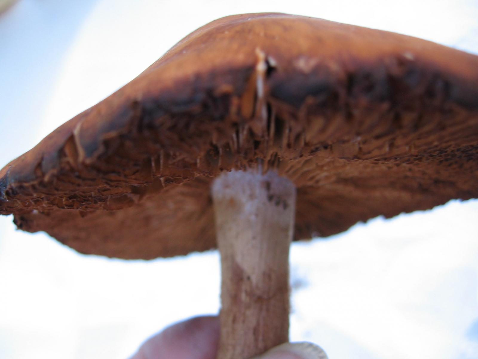 Nach dem folgenden Pilz habe ich aber in meinen Büchern vergeblich gesucht, dabei sieht der sehr individuell aus, wie ich finde: Ein bildschöner Pilz, der feste, glatte Hut ca. 13 cm Duchmesser mit einer Huthaut, die exakt so aussieht wie eine Haselnußschale, samt Maserung. Die Dinger standen in Rudeln auf feuchtem, moosigem Boden, Hauptbäume waren dort Fichten und Hainbuchen. Die Bilder sind erst viele Stunden nach dem "Ernten" gefertigt, aber der hier fast schwarz gefärbte, rissige Hutrand war schon vorher sehr dunkel. Die Lamellen dunkelten ebenfalls noch nach. Ist das ein Rißpilz? Das vermute ich nur wegen des Hutrandes, aber eigentlich habe ich keine Ahnung. Ihr vielleicht? Das wäre schön!