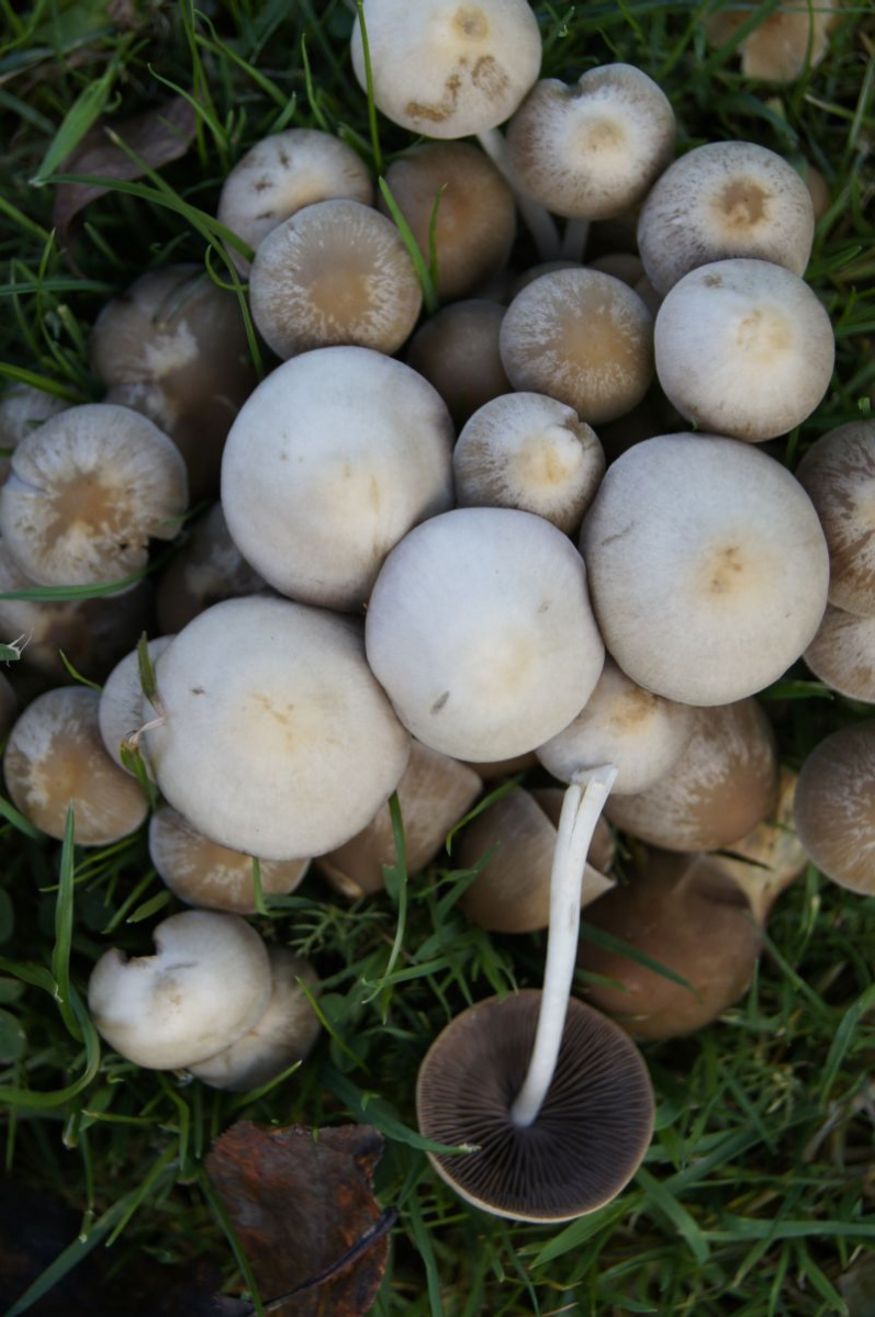 Ich bin auch nicht mal hundertprozent sicher, ob beides der gleiche Pilz, weil bei der Gruppe der letzten Aufnahmen der Buckel fehlt, während der bei den anderen fast immer ein kleiner Buckel vorhanden ist.