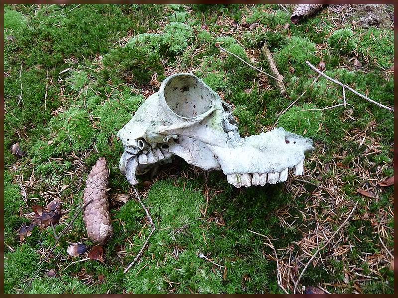 Ansonsten findet man hier oft Tierschädel (mal ganze, mal nur Fragmente), verschiedene Knochen (am häufigsten aber Rippen, Wirbel und Beine...einmal war es ein halbes Rehbein mit Fell...buäh), aber auch eine alte Münze und mehrere Knöpfe - von Uniformen, 2. WK - habe ich schon öfter gefunden.
