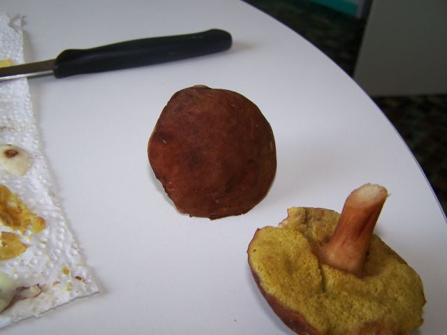Also der Hut ist samtig. Und die Röhren sehr grob und gelb. Verfärbt sich nicht auf Druck. Der Stiel ist außen bräunlich und ein bischen wie glasig.