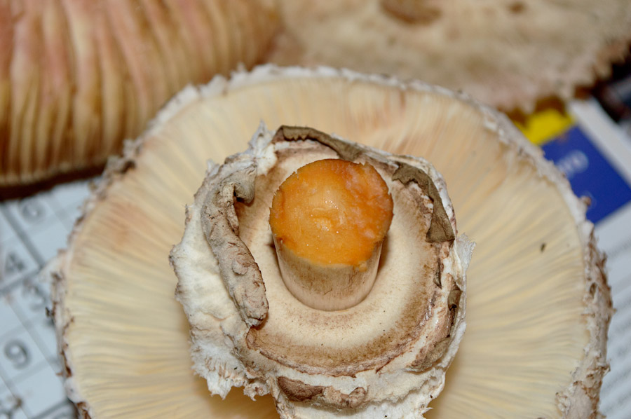 Merkmale des Safranschirmlings treffen alle zu, manche sagen, er müsse einen verschiebbaren Ring haben, andere schreiben, dieser muss nicht verschiebbar sein. Bei diesen Exemplaren ist der Ring NICHT verschiebbar, sondern über eine Haut mit dem Hut verwachsen. Der Geruch ist angenehm pilzartig, bei Verletzung sofortige Verfärbung ins rötlich-orange-safranfarbige, vor allem am Stiel.