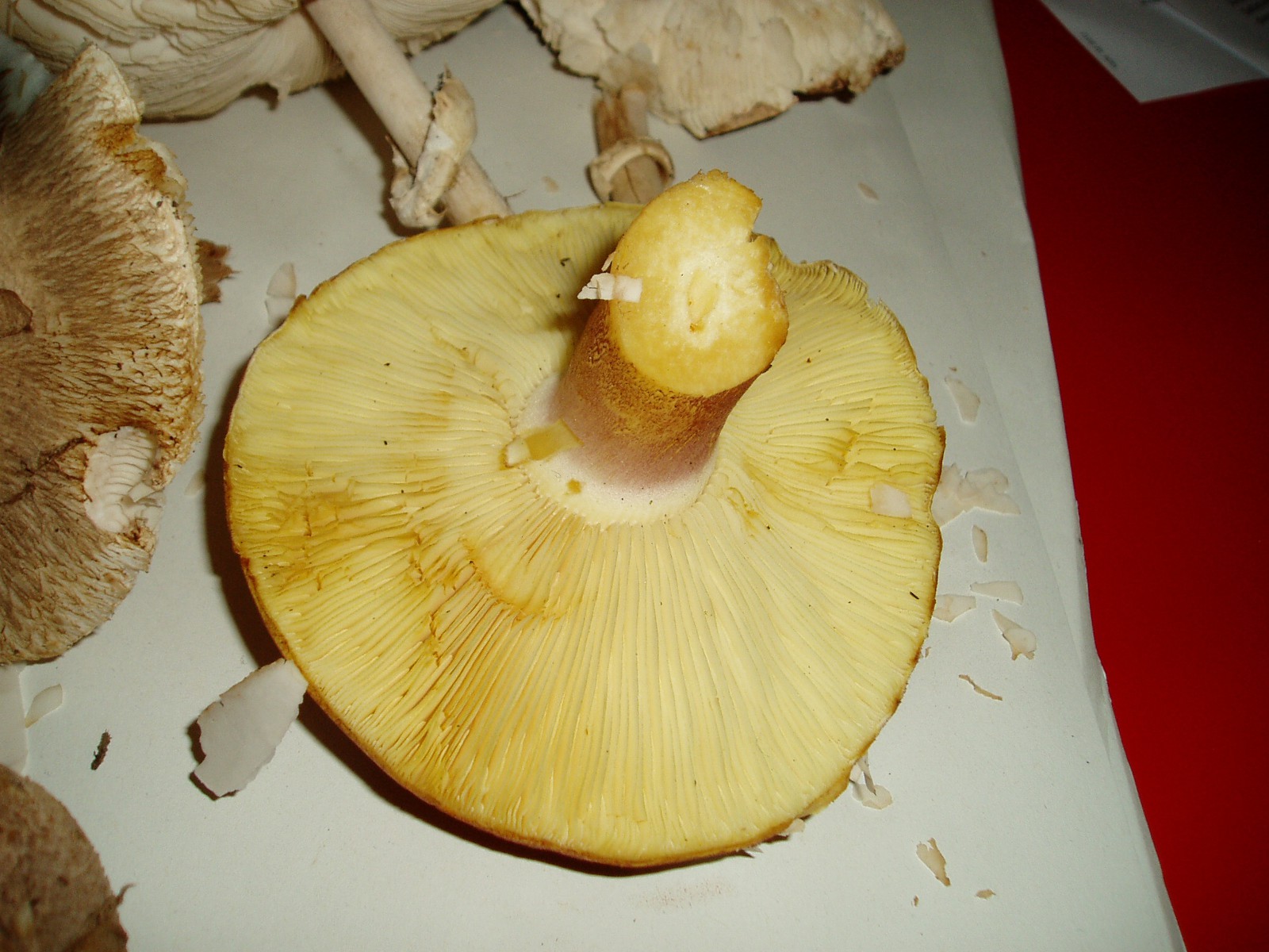 Tricholomopsis Rutilans ... ich glaube, den habe ich neulich auch gefunden - gelbliche Lamellen und mit rot überhauchtem Stiel ... und ich dachte, das wäre ein Täubling. Nur die gelblichen Lamellen fand ich etwas seltsam...