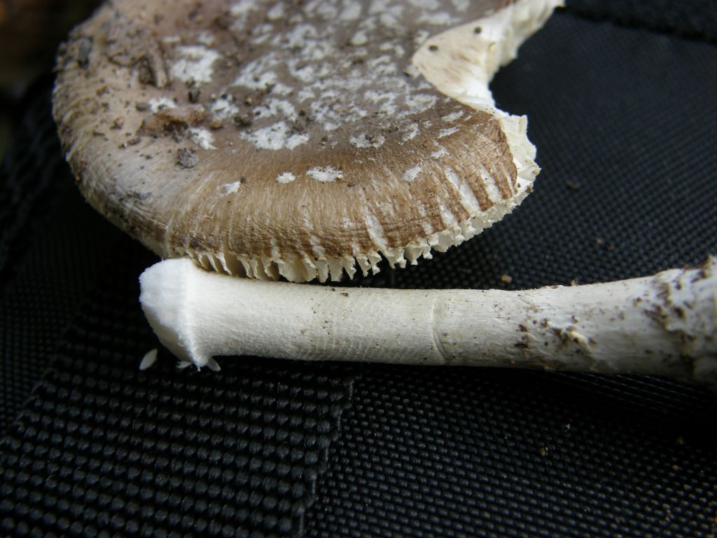 Der Kerl hier ist ungewöhnlich. Flache, wattige Flocken; kaum gerandete Knolle; Ring futschi. Verfärbung unter der Huthaut und geriefter Hutrand verraten aber auch dieses kleine Kerlchen, das leider nur so lose in die Wegböschung gesteckt war, und bei der ersten Berührung aus den Latschen kippte.