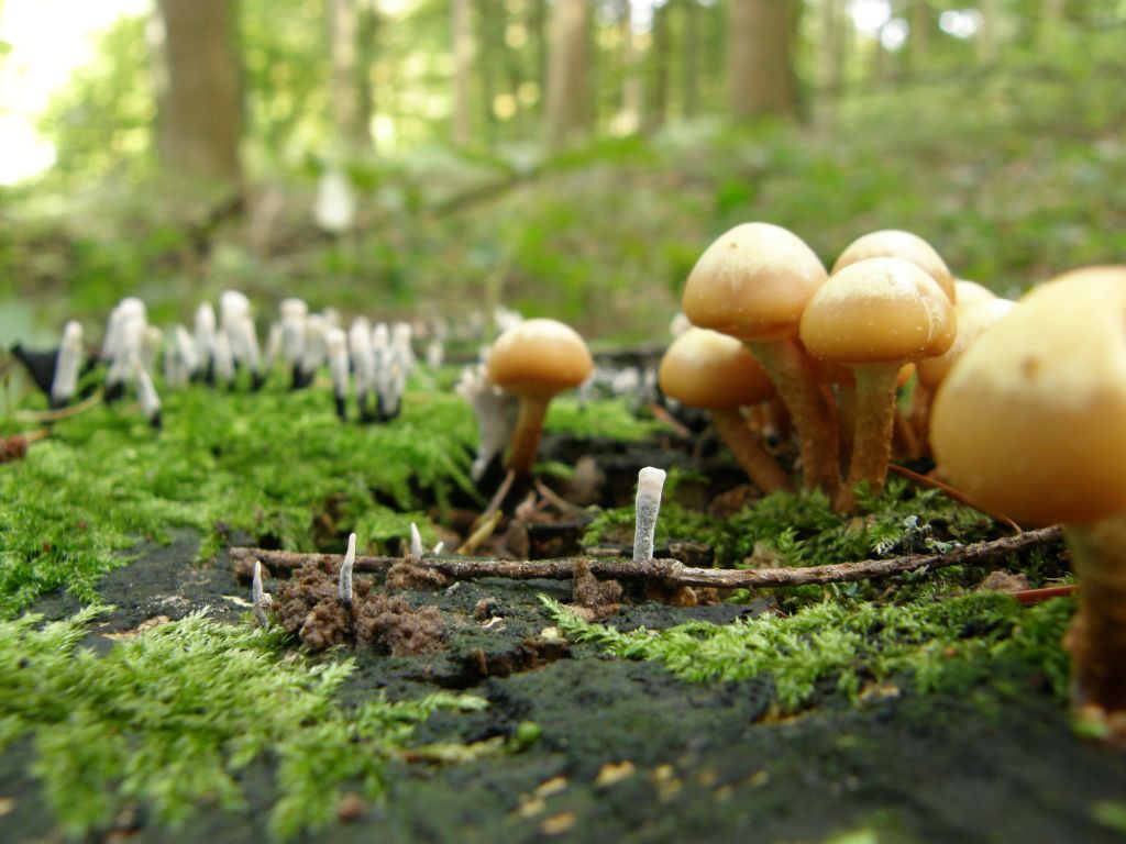 Das weiße daneben könnte etwas in die Richtung Clavaria Vermicularis sein. Ist aber unscharf. Da muss ich an einem Donnerstag oder Samstag noch mal hin.
