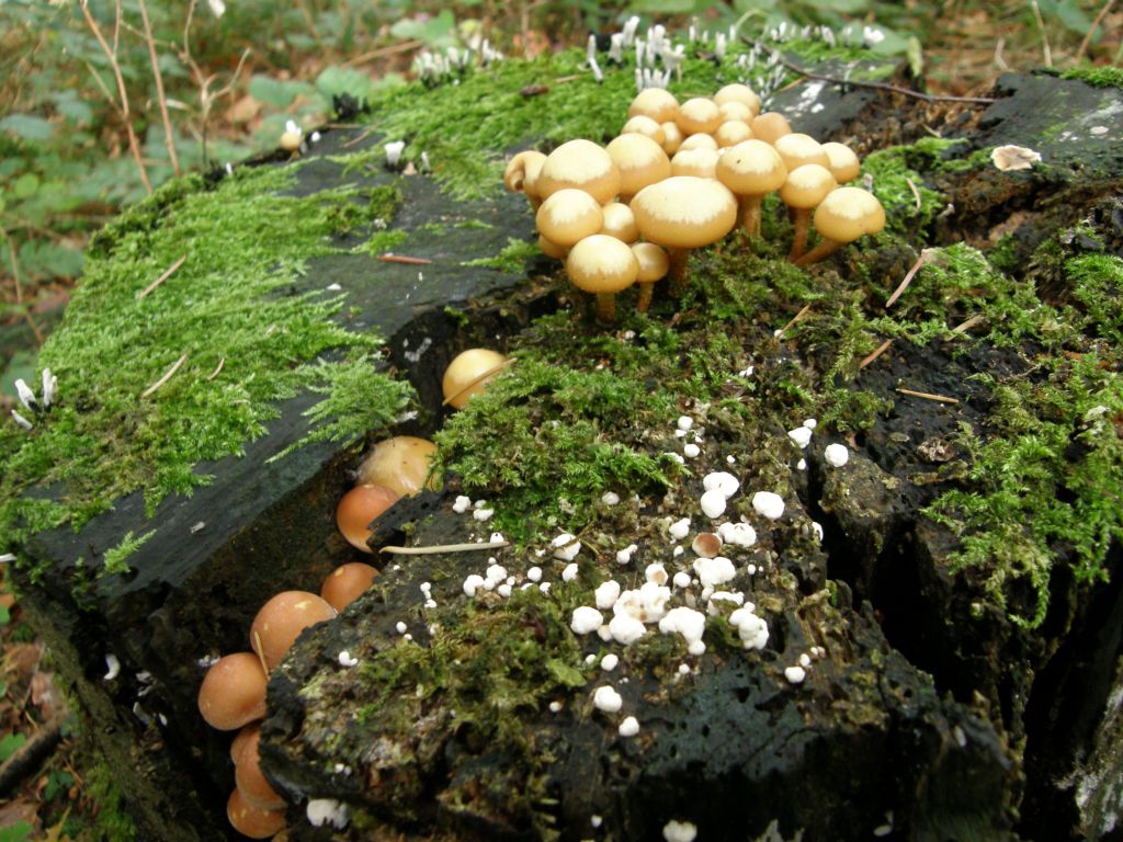 3) Bitte Mischen: weißlicher Helmling, Mycena spec. und Flämmling, Gymnopilus Penetrans