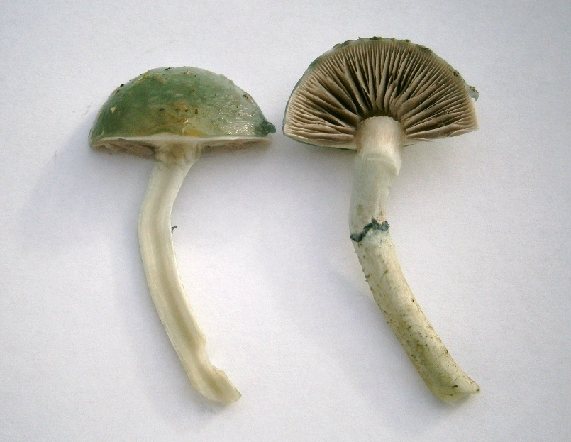 Stiel: 6 cm, zylindrisch bis zur Basis, 0,6 cm dick, deutlicher Grünblauer Gürtel, unter dem Gürtel ist der Stiel "genattert", an der Basis nicht keulenförmig erweitert, sondern gleichbleibend zylindrisch. Beim Aufschneiden ist ein Hohlkanal erkennbar.