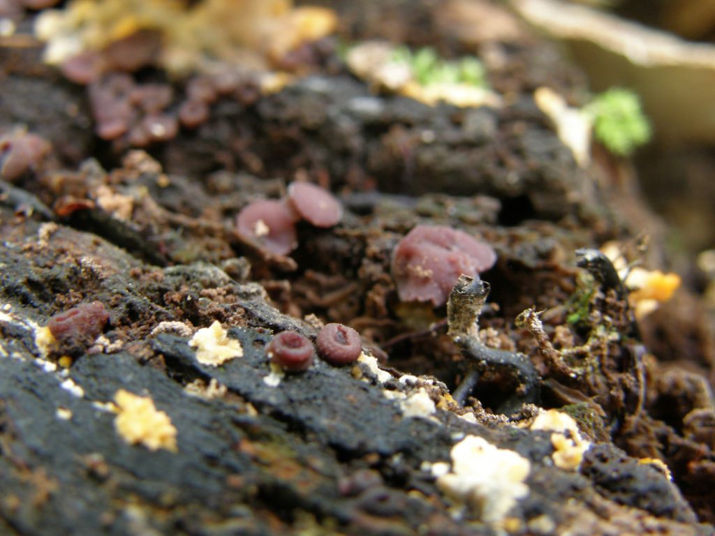 ich habe heute einen Gallertbecher gefunden, den ich eigentlich sicher für den Fleischroten gehalten habe, denn es war auch die Nebenfruchtform (Coryne dubia) vorhanden (ganz links im Bild). Ich habe die HFF aber trotzdem mal mitgenommen, um ihn mit einem kürzlich gefundenen A. cylichnium zu vergleichen. Dann kam aber die Überraschung: Die Sporen besitzen viele kleine Öltropfen und messen 25-30 x 5-7 µm. Also jetzt doch A. cylichnium.