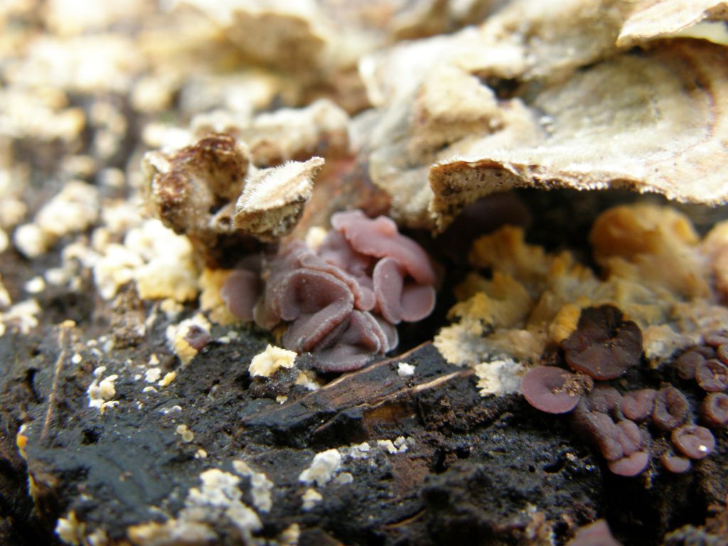 ja, das sind auch Gallertbecher (Ascocoryne spec.). Allerdings würde ich kein "cf. ..." dahintersetzen, weil auch cylichnium nicht selten ist. Dann sind dort noch der Orangerote Kammpilz (Phlebia radiata), eventuell eine Schmetterlingstramete (cf. Trametes versicolor) und noch irgendwas Vertrocknetes zu sehen. ;)