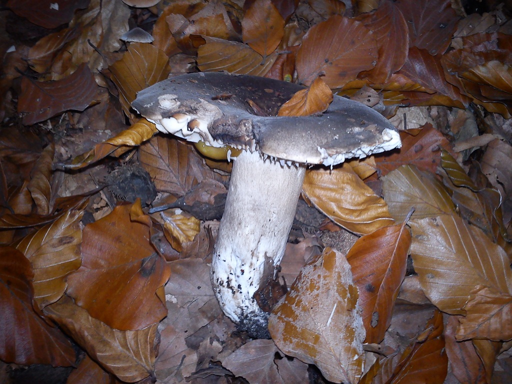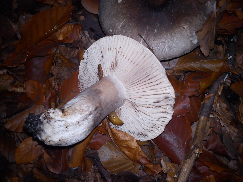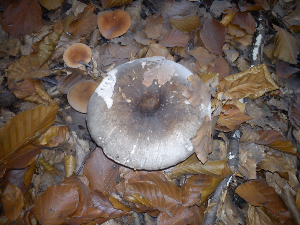 Dieser ist ein Fund aus einem Buchenmischwald einfach im Laub in einiger Entfernung vom Stamm, Hut gräulich, dickerer Stamm und Lamellen eher weiß. Hutdurchmesser von diesem großen Exemplar