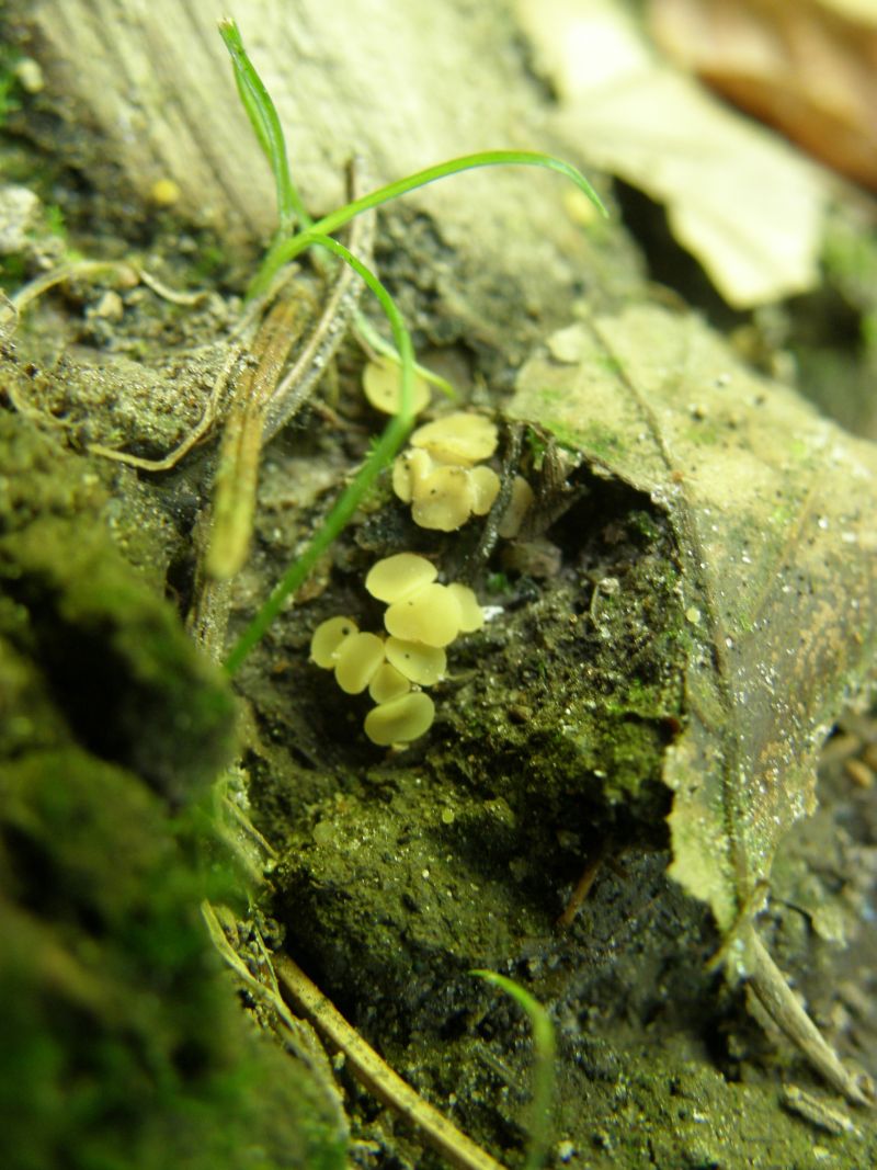 Lanzia luteovirescens, Grüngelber Stromabecherling, an liegenden, oft vergrabenen Ahornblattstielen