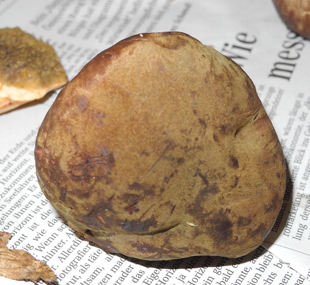 Pilz 1 ist ein etwas mißgestalteter Steipilz, Boletus Edulis, mit Schimmelbefall an den Poren.