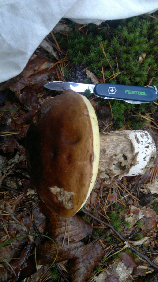 Auch solche Maronen habe ich früher mitgenommen und gegessen. Wenn der Hut fest ist, dürfte das immerhin kein gesundheitliches Problem sein. Heute würde ich da wegen der aatemberaubenden Größe ein hübsches Bild machen, den Pilz kurz tätscheln, und dann weitergehen. Ohne den Pilz zu pflücken.