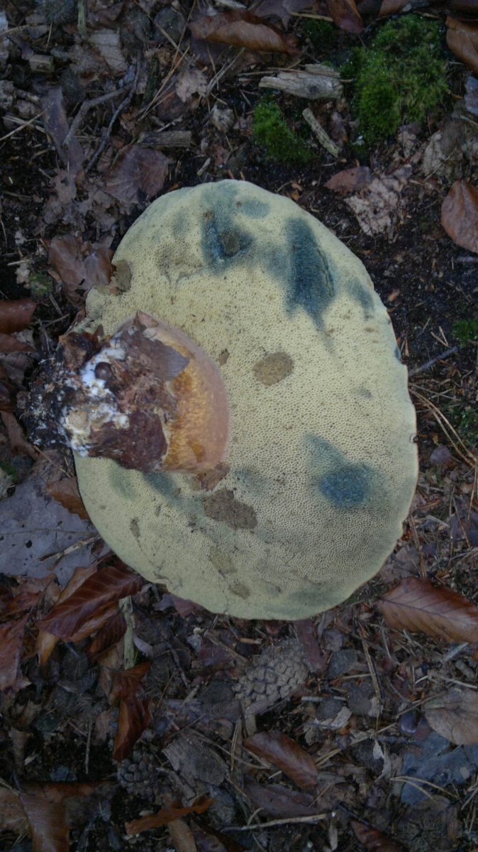 Muss ganz schön kalt gewesen sein in den Nächten. Solcherart aufgeplatzte Stiele bei Steinpilzen finde ich oft nach Nachtfrösten. Solange da die unteren Schichten nicht auch grau sind (wie hier) ist das kein Problem. Was mich an dem stört sind die Dellen im Hutfleisch: Fingerabdrücke? Der ist jedenfalls nix mehr für die Küche.