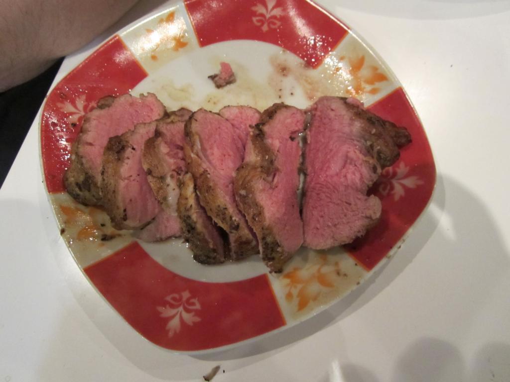 In der Zeit dann noch die Schweinelende von allen Seiten scharf angebraten und ab in den Backofen, 40 min bei 90 °. (Niedriggarmethode)