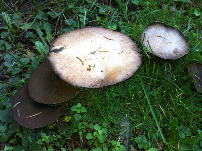 Die darauf folgenden Pilze mit dem hellen Hut und den dunkeln Lamellen dürften überaltete Champignons sein (Agaricus spec.), allerdings kann man die genaue Art ohne Schnittbild, Angaben zu Geruch und ob und wo sie gilben, nicht bestimmen. Auch bei den Champignons gibt es übrigens Giftpilze.
