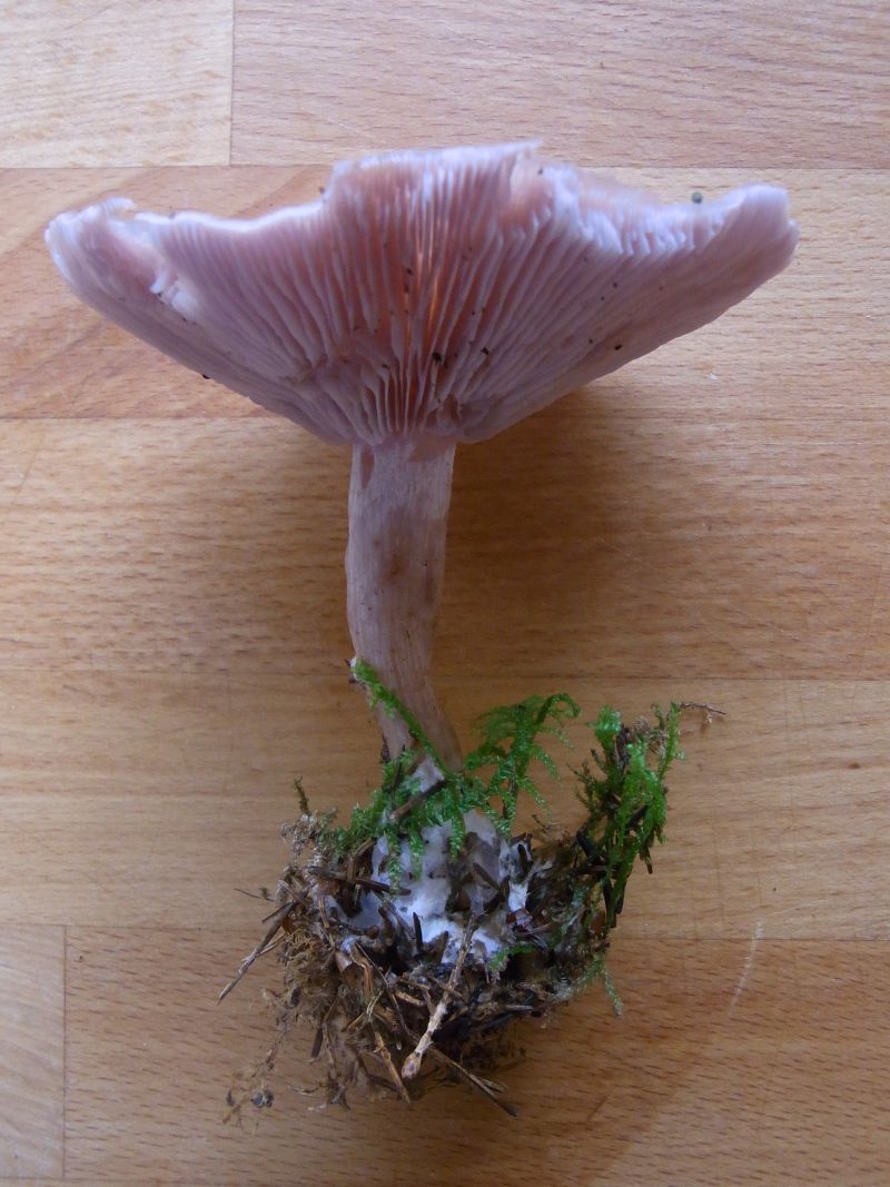 Der Pilz war violett gefärbt, wobei der Hut leicht ins bräunliche übergeht, dieser hat sich auch bei Druck oder nach dem Schnitt nicht verändert. Der Hut hat einen Durchmesser von ca. 10 cm und der Stiel ist ca. 6 cm lang. Gefunden habe ich ihn auf einem moosbedeckten Weg in einem Fichtenwald. Er riecht sehr aromatisch, irgendwie nach Lavendel finde ich.