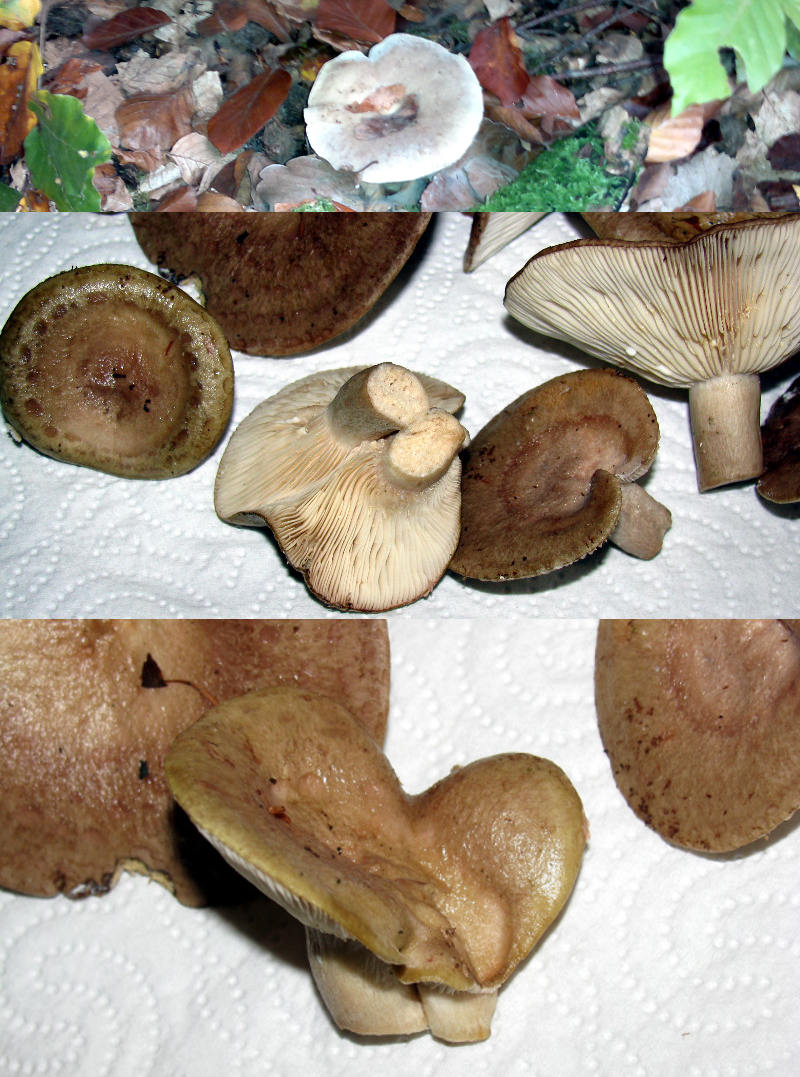 - Die Hutfarbe bietet eine Palette von grün über grau bis braun. Bei vielen Exemplaren konnte ich beobachten, dass die Hutoberfläche an den äußeren Rändern olivgrün ist mit einer Art Verzonung oder Muster und nach innen hin bräunlicher wird und dort oft Regenwasser steht. Manche Exemplare sind auch komplett grau-braun.