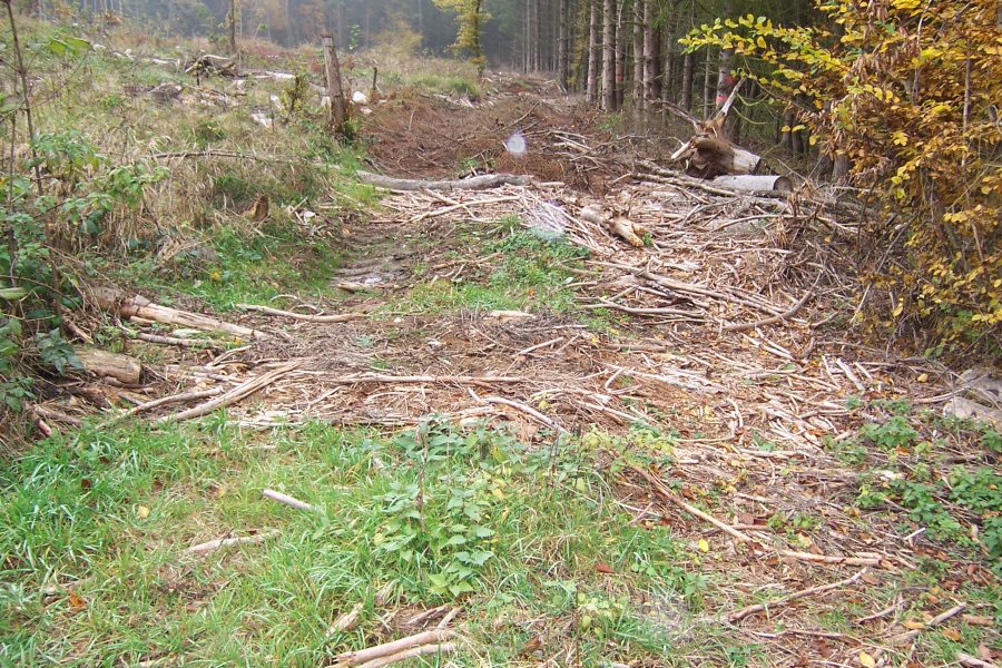Standort: ca 300 m hoch, auf einem grasigen Waldweg in einem Fichtenforst, der aber auf einer Seite in einem der Stürme der letzten Jahre umgeworfen wurde, die Stämme wurden beseitigt, allerdings liegen noch Äste etc. auf dem Waldweg.
