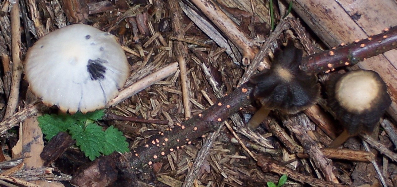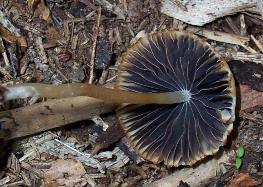Auf den ersten Blick: schwarze Lamellen. Aber unter der Stereolupe zeigt sich: die Lamellen sind hell, sind aber dicht mit schwarzen Punkten bedeckt (Sporenstaub + Guttationstropfen?). Außerdem war ein großer milchiger Guttationstropfen zu sehen.