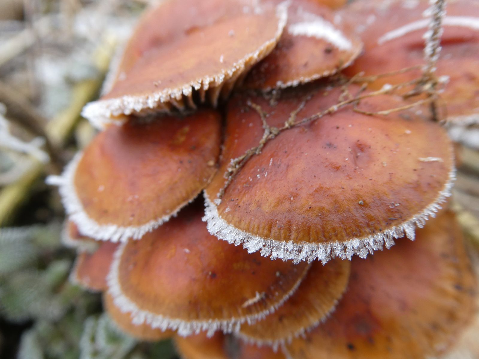 Ich halte diesen Pilz für einen Winterhelmling von 5.1.25, Foto unter finsteren Bedinungen beim Eisregen geschossen