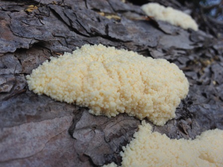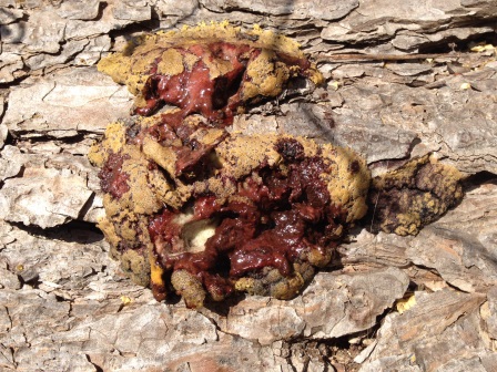 Ich bin weder Pilz- noch Fotospezialist und mache auch nur berufsbedingt Fotos von Baumpilzen, aber die Abfolge der Entwicklungsstadien (zw. 30.03. - 07.04.2014) vom Lachsfarbenen Schleimpilz (Tubifera ferruginosa) - hier mal nicht wirklich lachsfarben - auf einem liegenden Stamm einer Schwarz-Kiefer finde ich richtig spannend.