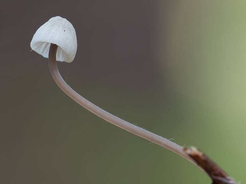 Buchenblatthelmling (Mycena capillaris), Gesamtlänge etwa 1 cm.