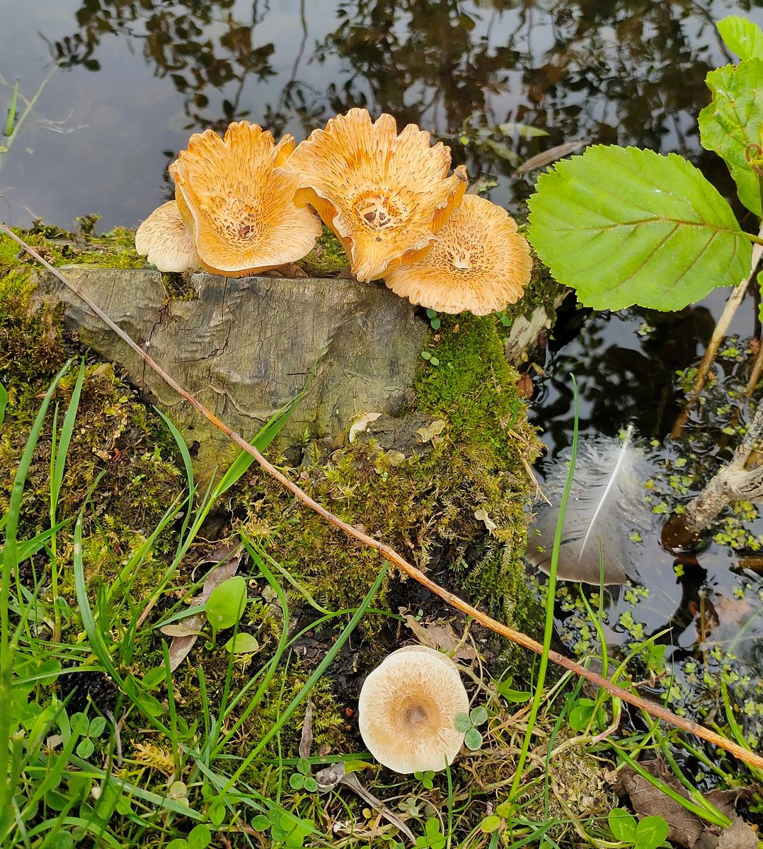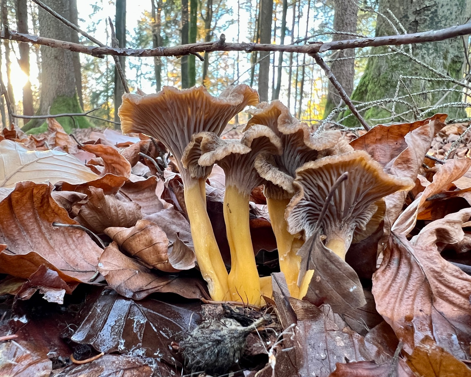 hier eine Gruppe Caloboletus radicans, Wurzelnder Bitterröhrling, in Fachkreisen auch WuBi genannt. Auffällig hier die roten Flecken an den Stielen, welche alle Funde in diesem Gebiet aufweisen.