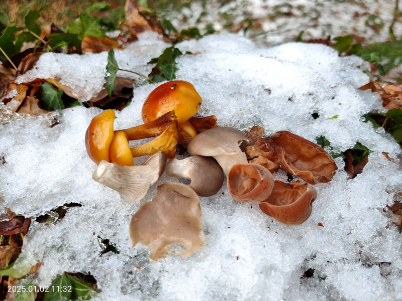 Ich halte diesen Pilz für einen Winterhelmling von 5.1.25, Foto unter finsteren Bedinungen beim Eisregen geschossen