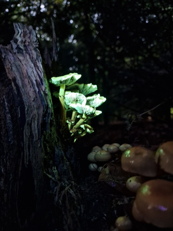 Grünblättriger Schwefelkopf mit einem schwachen UV Licht beleuchtet.