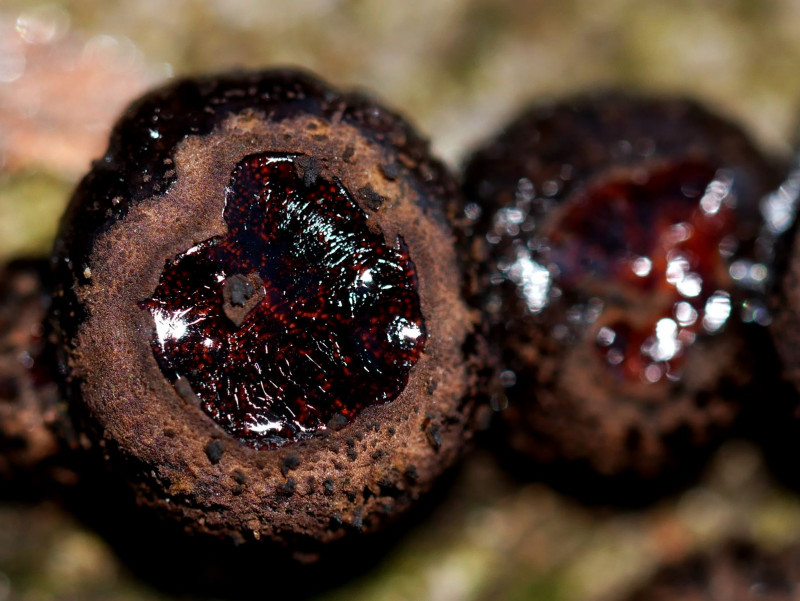 Vielleicht lohnt es sich, auch mal um die schnöden Schwarzen drumrum zu gucken. Ich hab nämlich den Eindruck, dass die Wahrscheinlichkeit größer ist, bei jüngeren Fruchtkörpern und einer gewissen kürzlich vorausgegangenen Feuchtigkeit solche Rottöne zu entdecken. Es waren auch nicht alle jungen FK rötlich, da musste ich wirklich nach suchen. Aber sie waren da. Zuerst hatte ich auch nur die normalen gesehen und mir gedacht, hey, vielleicht sind ja trotzdem ein paar rote dabei..
