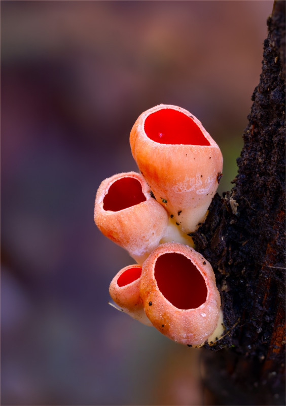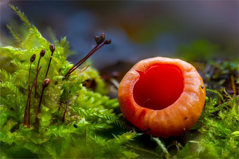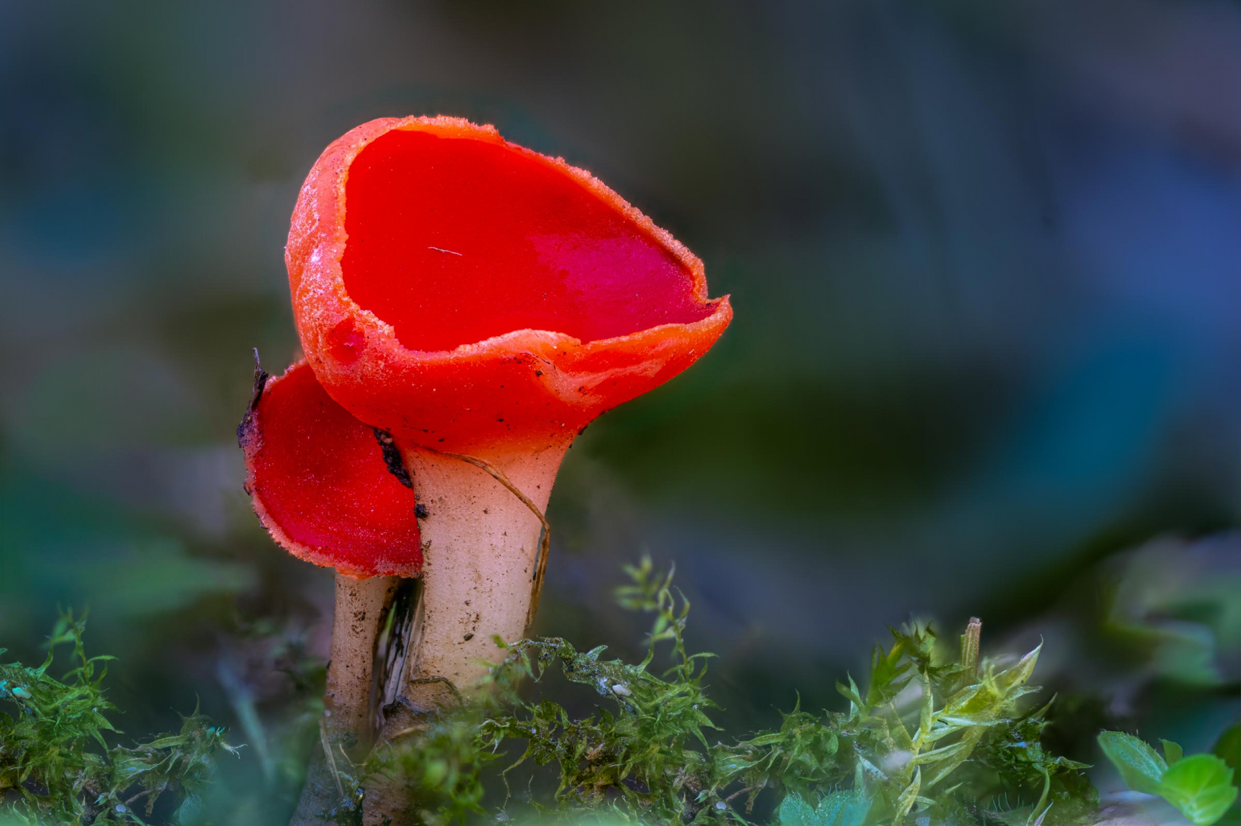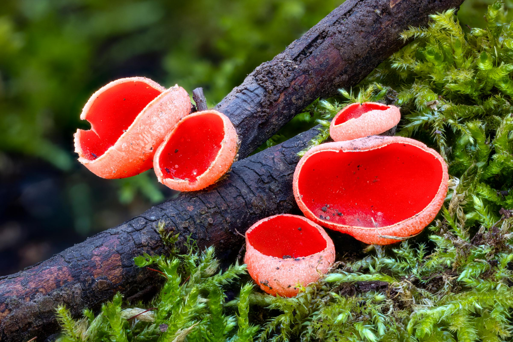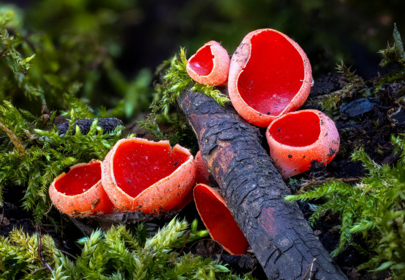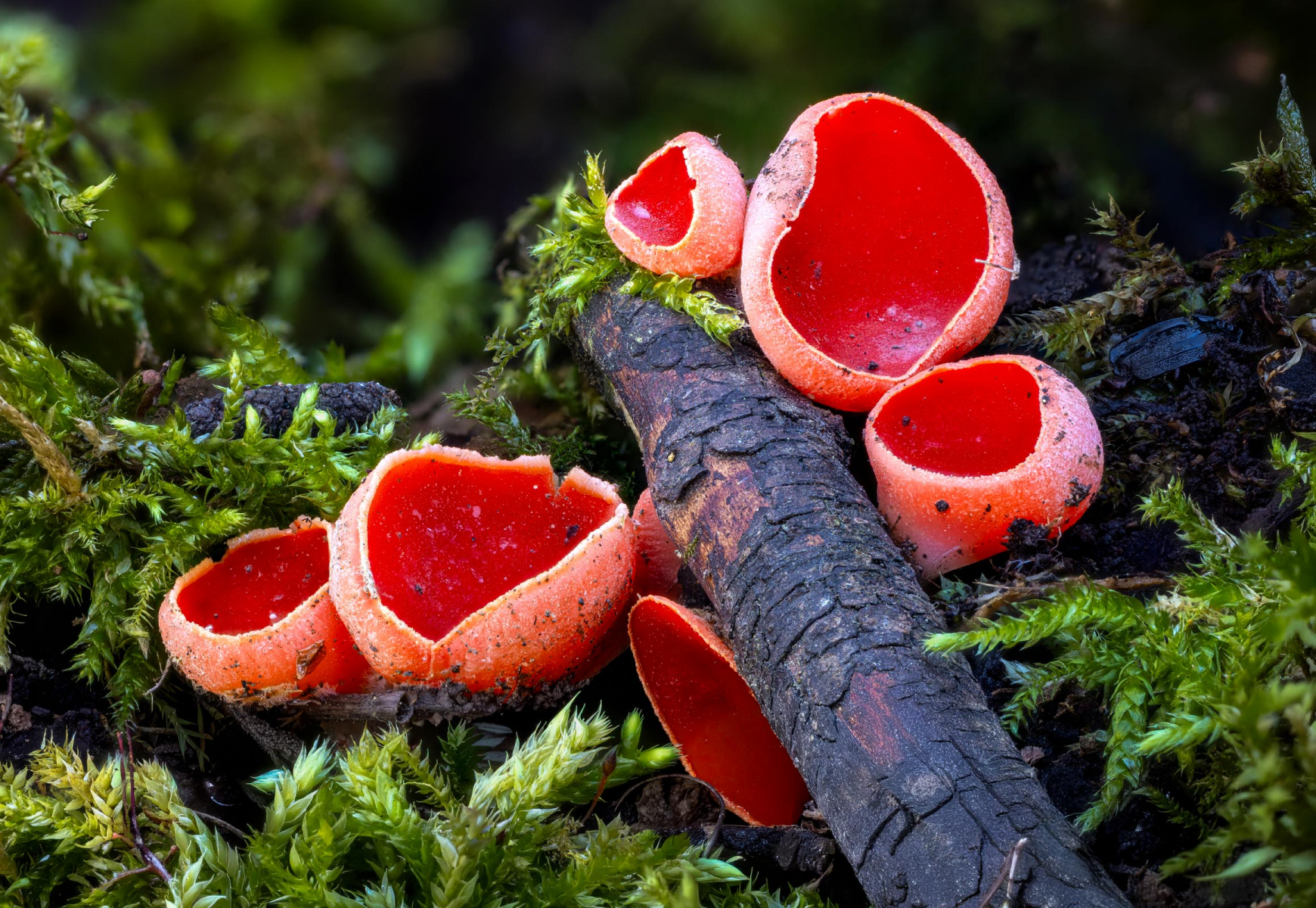 zu unseren schönsten Winterpilzen dürften wohl die Kelchbecherlinge gehören. Ich möchte hier ein paar Aufnahmen der beiden häufigsten Arten (es gibt insgesamt drei) vorstellen. Schon vorab sei gesagt, dass sich die beiden Arten makroskopisch wohl nicht voneinander unterscheiden lassen, nur mit Hilfe der Sporenuntersuchung kann die Art zweifelsfrei festgestellt werden. Beide Arten wachsen auf am Boden liegenden, meist schon verfaulenden und bemoosten Zweigen und Ästen von Laubbäumen. Sie bevorzugen feuchte Standorte, also z.B. Au- oder Schluchtwälder oder die Nähe eines Flusslaufs. Die leuchtend roten Fruchtkörper erscheinen in manchen Jahren bereits im Dezember, die Hauptfruktifikationszeit ist jedoch der Februar und März. Sie sind bei uns selten; wenn sie aber auftreten, dann meist gesellig in Gruppen.