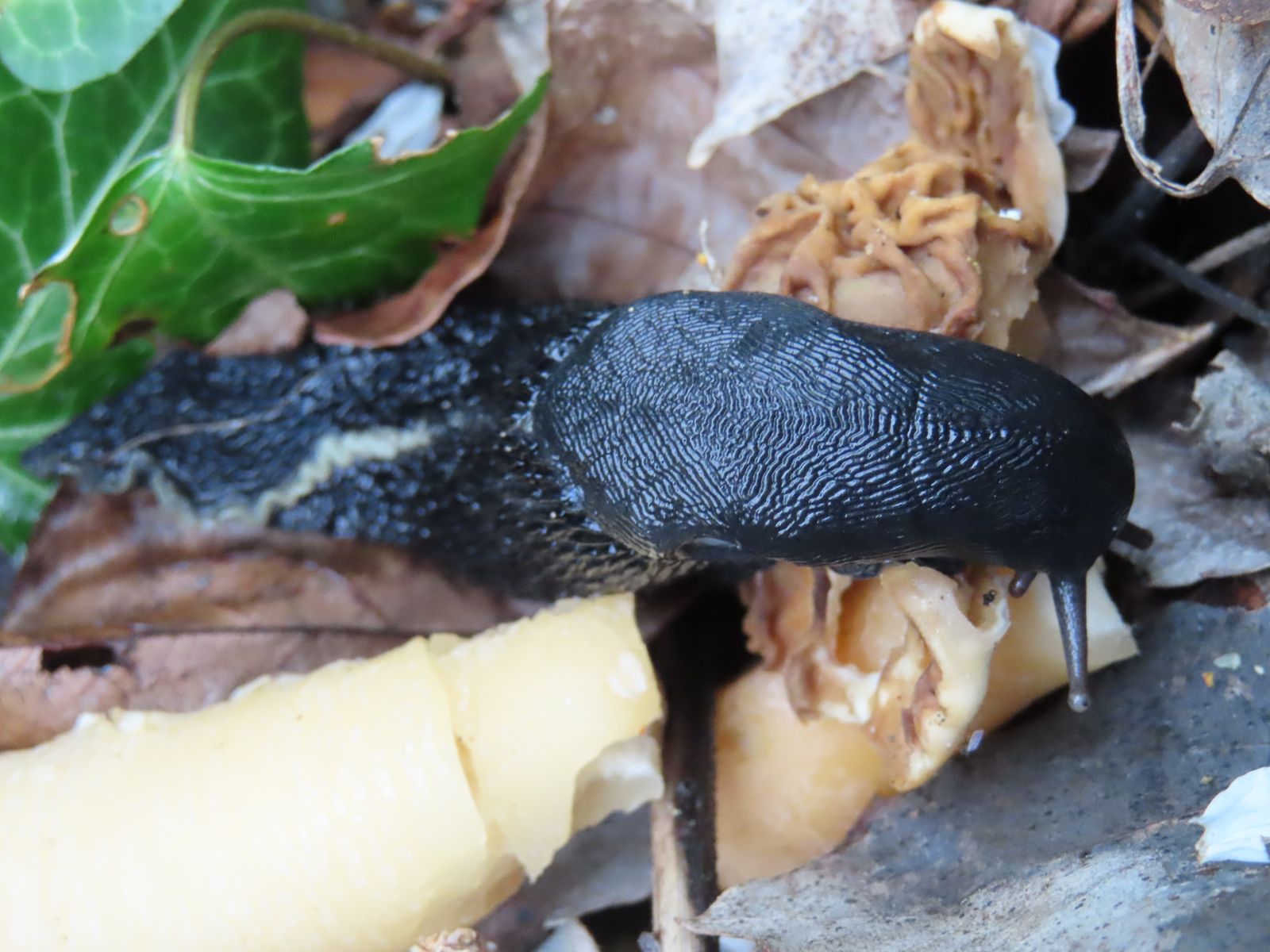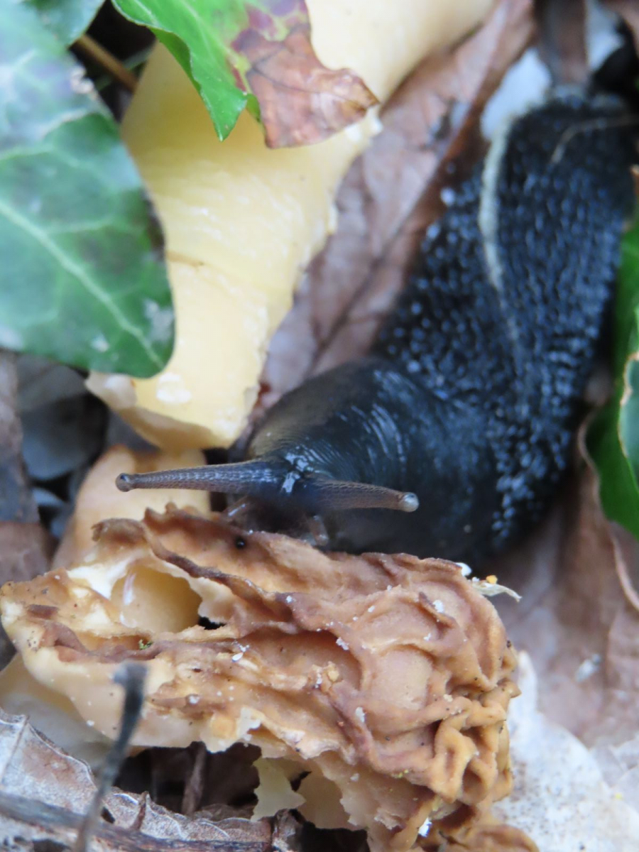 Dieser schwarze Schnegel hat eine besondere Vorliebe für den Verpel-Hut; den Stiel läßt er stehen oder liegen und köpft lieber die nächste Runzel-Verpel.