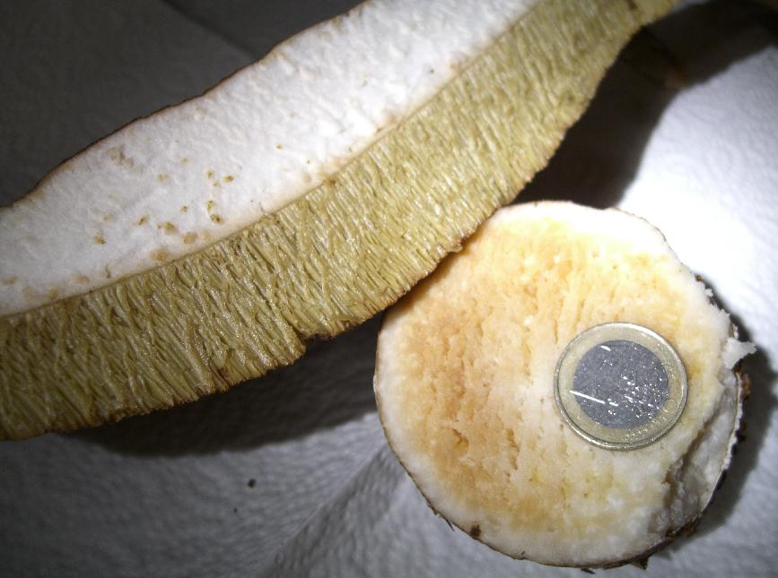 Kein Blauen, weder auf Druck noch Schnitt, weder an Röhren, Poren, Fleisch oder Stiel.