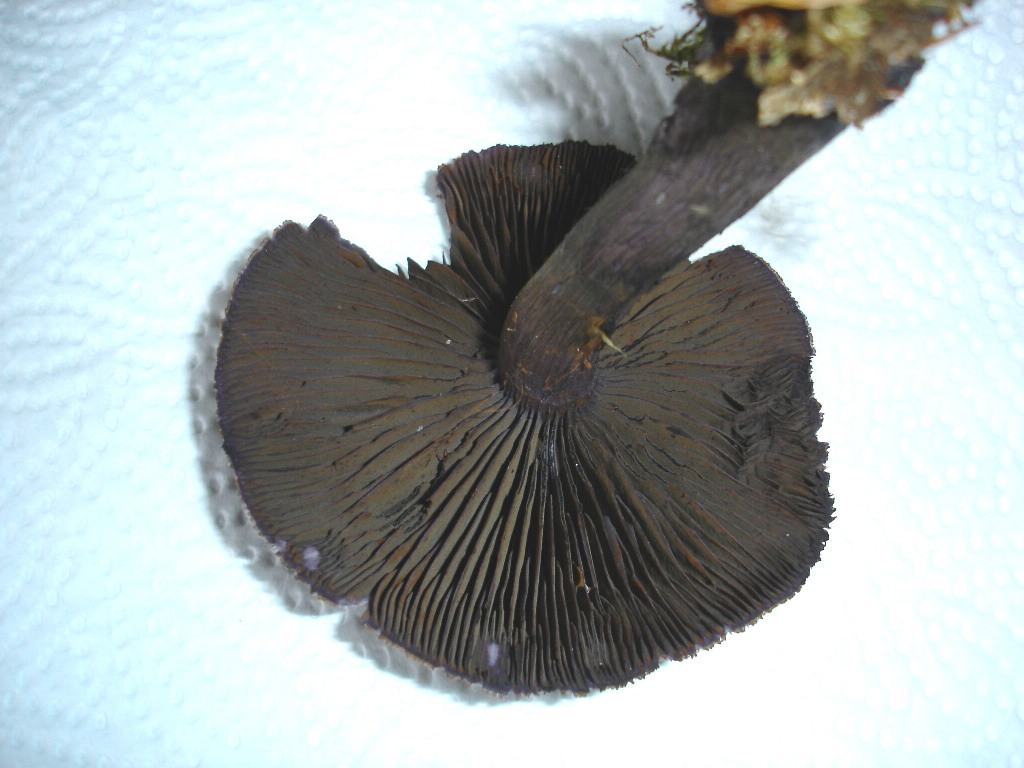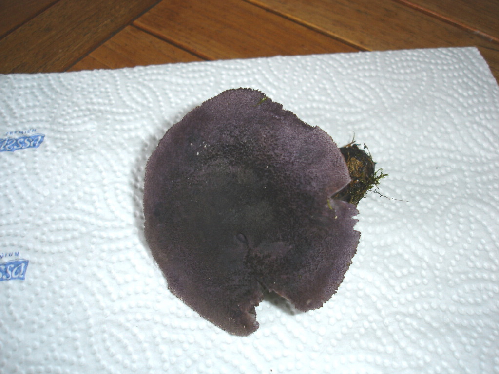 Der Hut ist velourartig überzogen und die Farbe geht von kräftigem Violett am Rand zu tiefem, samtigem Dunkelbraun in der Hutmitte. Die Lamellen scheinen dunkelocker-oliv überhaucht (Sporen?) Der Stiel ist ebenfalls dunkelviolett und faserig. Riecht sehr angenehm mit einem Anflug von Anis. Weiß jemand, um welchen Pilz es sich handelt? Ist er essbar, evtl. gut?
