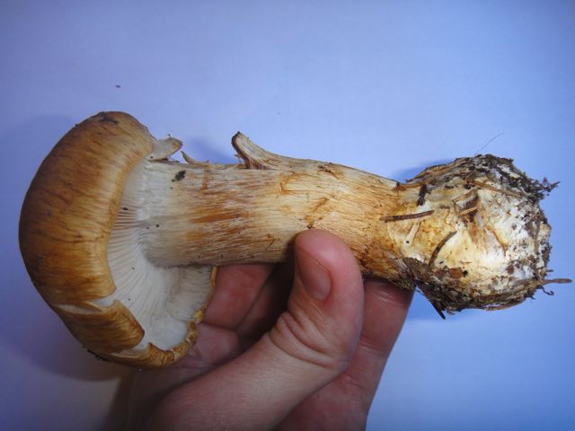 • Der Leucocortinarius würde natürlich gut zu den hellen Lamellen passen......allerdings hat der auf den ganzen Photos, die ich gerade gefunden hab ( in Natura kenn ich den nicht) eine viel stärker abgesetzte und größere Knolle....das find ich spricht dagegen.