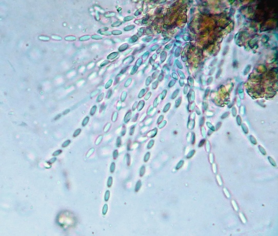 • Das ist jetzt schon über die Grenze dessen, was ich halbwegs vernünftig ablichten kann. Die Sporen liegen überwiegend Pol an Pol. Hier und da sind auch mal welche verschoben. Das, und auch die geringe Sporengröße müsste doch für Phomatospora coprophila sprechen, oder ?