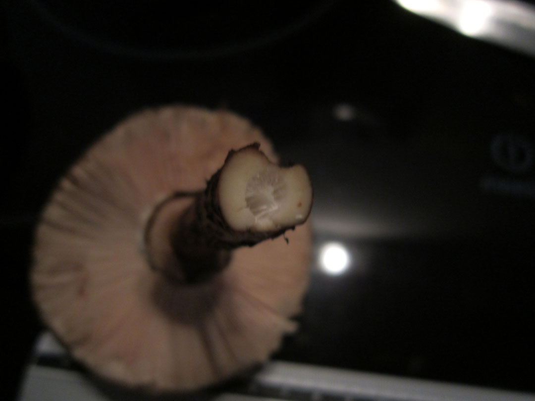 Stiel: Dunkelbraun geschuppt, hohl. Dunkelt bei Anschnitt NICHT nach.