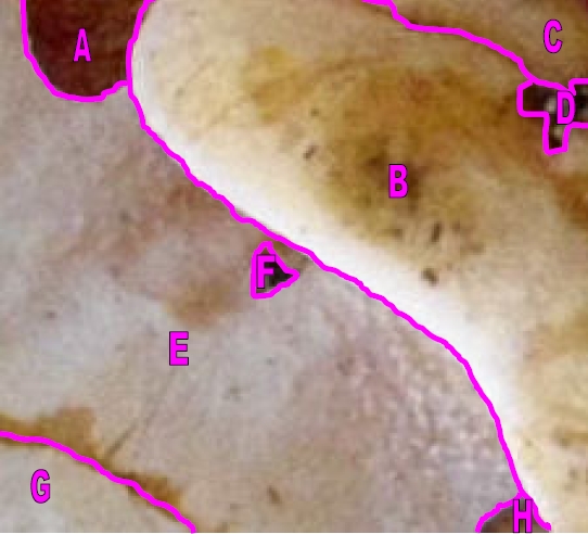 Ich meine, dass B, C und D ein gemeinsames Teil darstellen, ich tippe auf Hutoberfläche.Das sehe ich auch so, mit dem Unterschied, das D durchaus eine Anhaftung o.ä. sein kann.