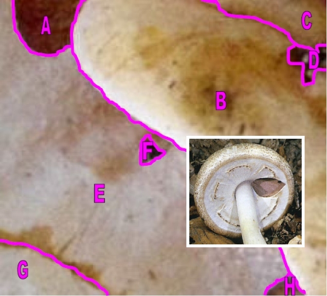 Dann wäre G der Stiel, E wäre ein Velum partiale, in A und evtl. auch in H wäre das aufgerissen so wie im Beispielbild. Mit der Hutfarbe tue ich mich noch schwer. Und auch mit der Antwort von Lutine auf die Frage, die ich garnicht gestellt habe.