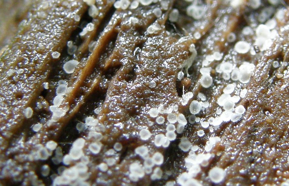 Diese Dinger habe ich alle für Schleimpilze gehalten. Wird aber das Konidienstadium der zerfließenden Gallertträne sein. Da war auch noch ein etwas größerer Glibber in der Art auf dem oben gezeigten Stamm. Aber der wollte nicht scharf werden.