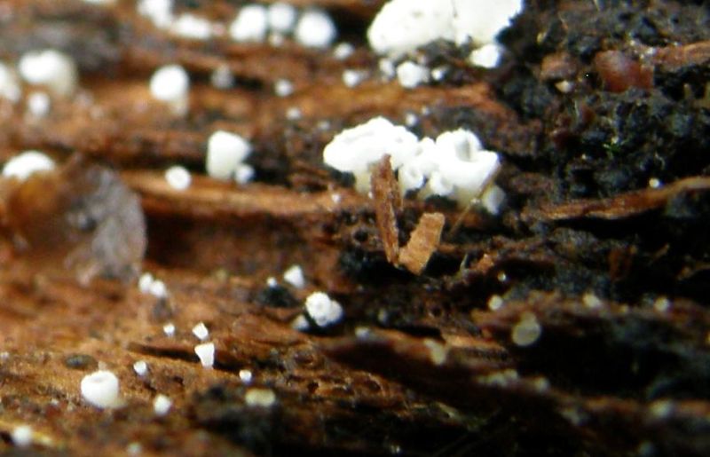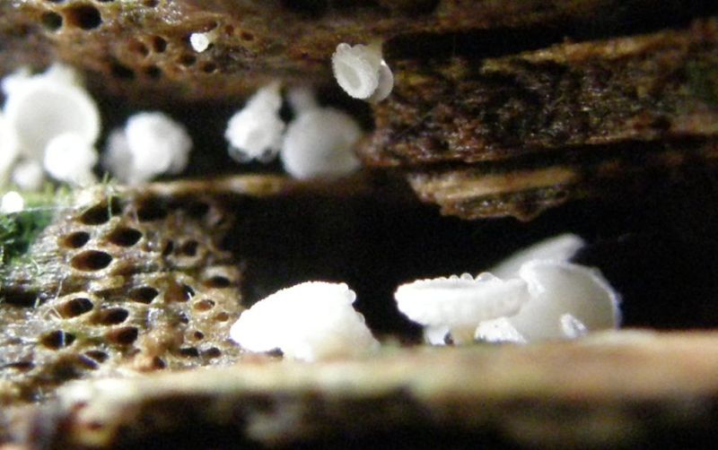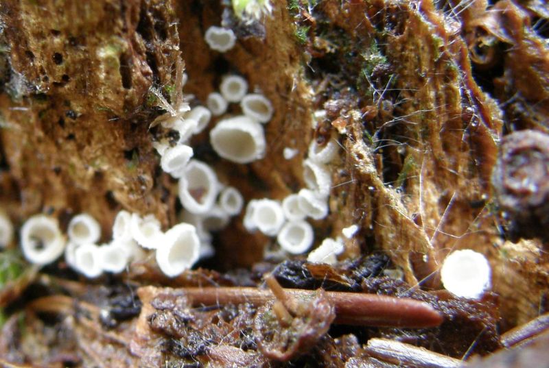 Lachnum virgineum (Jungfern-Weißhaarbecherchen) findest du erst im Frühjahr wieder, auch besiedelt die Art meistens recht dünnes Substrat, oft Blätter, Fruchtschalen, Samenschalen, Zapfen, dünne Zweige, nur seltener Holz bis 1 oder 3cm Stärke.