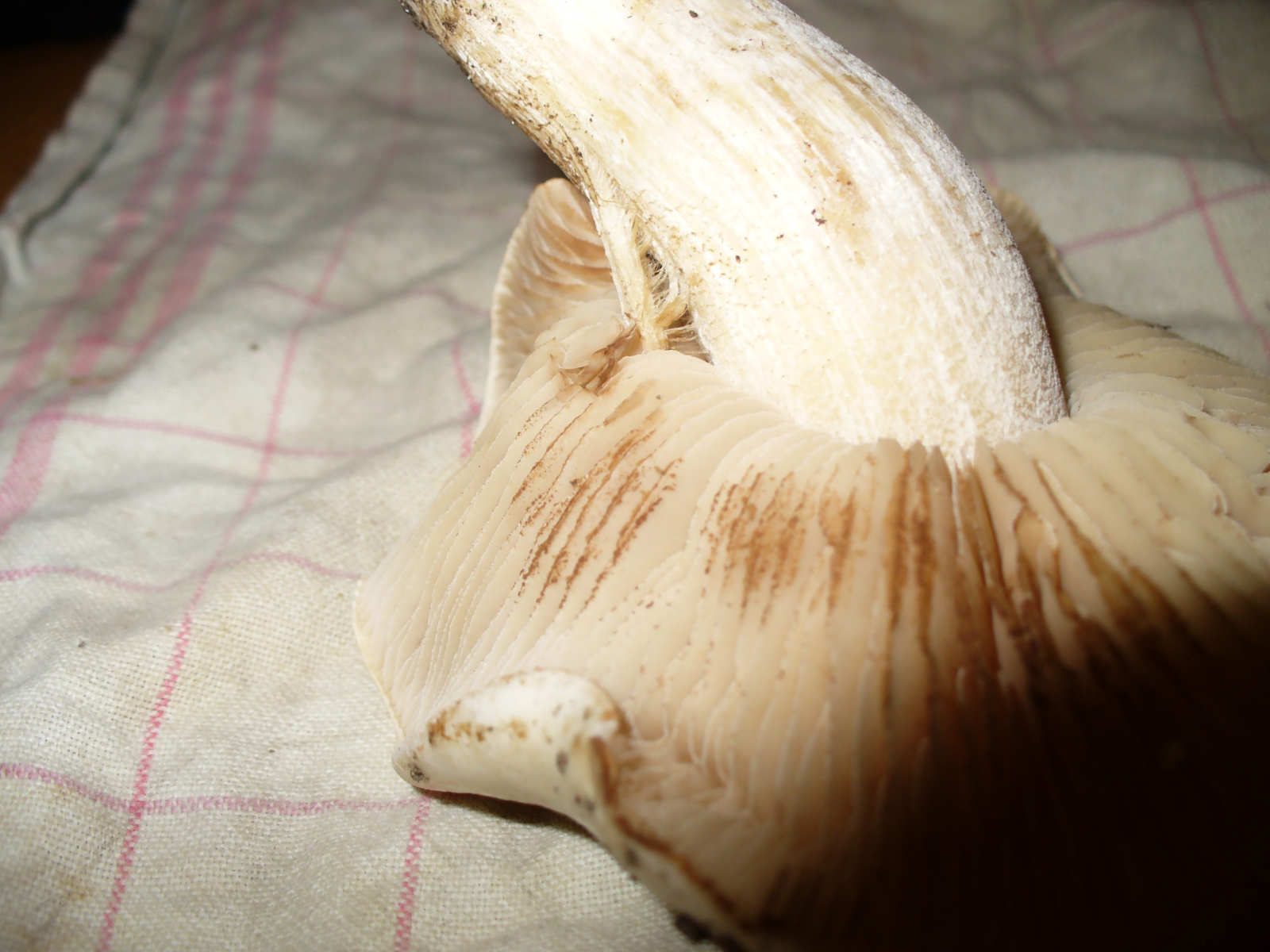 Die braunen (schmutz)Flecken an den Lamellen entpuppten sich unter dem Skop sofort als gelbbraunes Sporenpulver. Um sicher zu sein, dass die Sporen nicht von anderen Pilzen stammen, habe ich ihn aussporen lassen. Danach war der Verursacher klar.