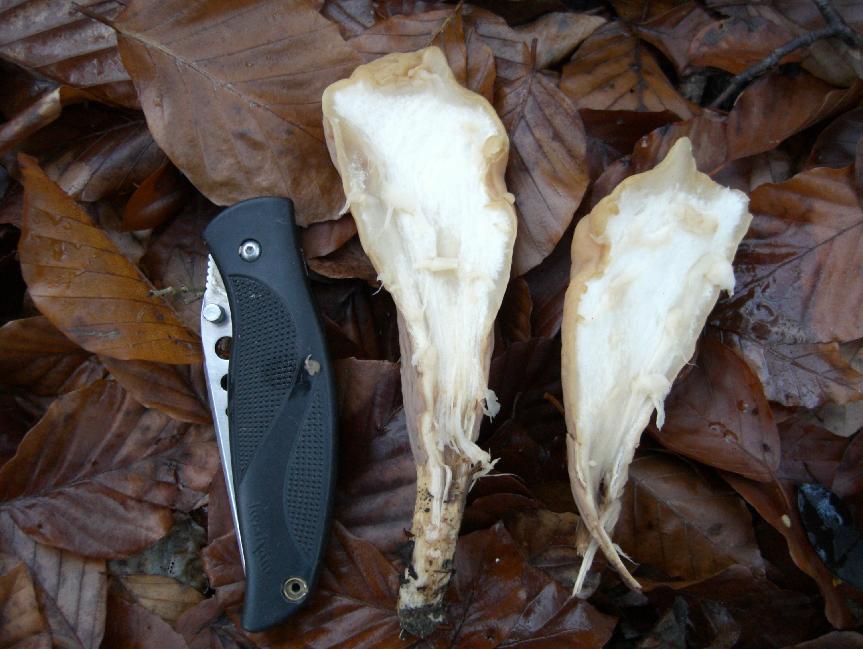 Das gezeigte Exemplar hebt sich bei Weitem hinsichtlich der Größe von den in unmittelbarer Umgebung gefundenen Herbstlorcheln ab. Extradung durch Hunde die ganz in der Nähe laufen schließe ich aber als Ursache aus. Was nichts heißen muss. Der Giga - Sommersteinpilz stand auch in der 50 x 15 Meter Waldecke. Mmh. Schwierig. Ein daneben stehendes kleiners Exemplar war schon verschimmelt.