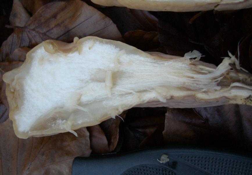 Lust but not least fand ich noch etwas, mit dem ich auf die Schnelle nichts anfangen konnte. Der Gesamtkorpus war ca. 14 cm hoch, Substrat war Buche, Eichen stehen in der Nähe. Keine Reaktion auf Ärgern. Oberfläche trocken, leicht samtig. Geruch angenehm, nicht sonderlich ausgeprägt. Fleisch innen fasrig. Hatte Wasser gezogen, vermutlich aufgrund der niedrigen Temperaturen in den letzten Tagen durchgefroren. Dazu hat doch bestimmt jemand eine Idee.